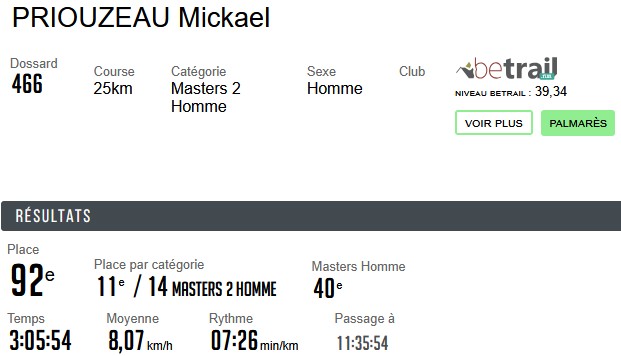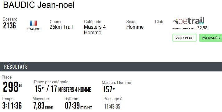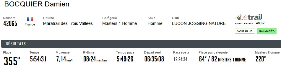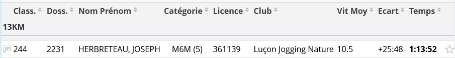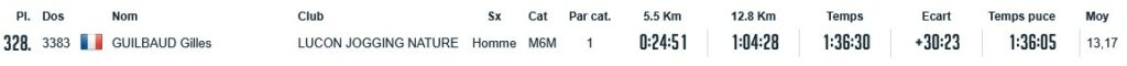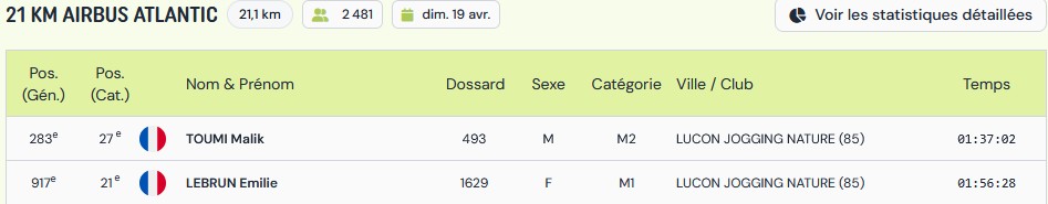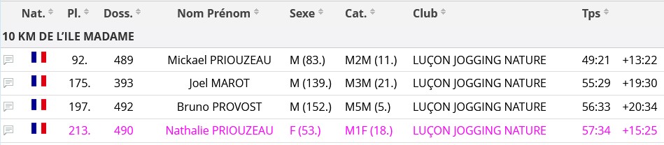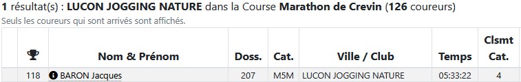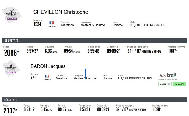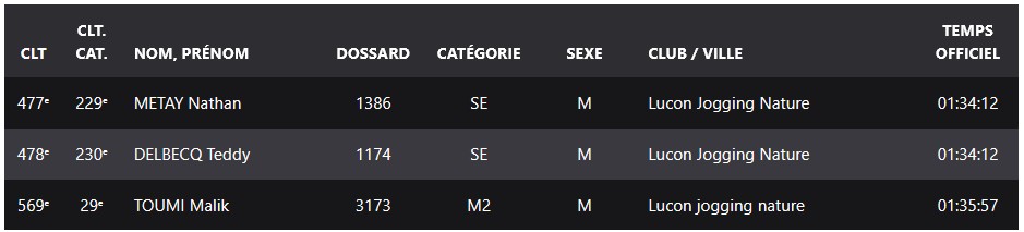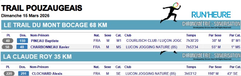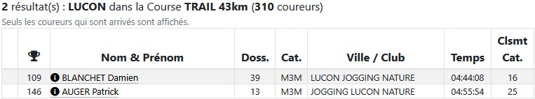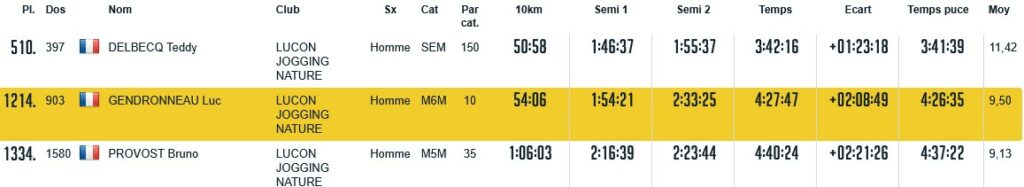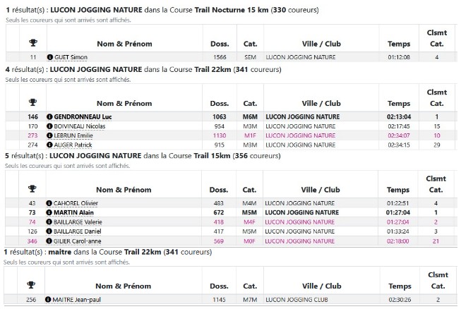 Résultats Club (Mise à jour le 19/04/2026) lucon jogging19 avril 202619 avril 2026 Semi Marathon de Rochefort le 19 avril 2026. Tous les résultats ICI. Marathon de St Emilion le 12 avril 2026. Tous les résultats ICI. Marathon et Semi Marathon de Poitiers le 12 avril 2026. Tous les résultats ICI. Marathon de Paris le 12 avril 2026. Tous les résultats ICI. Tiercé au Galop le 6 avril 2026. Tous les résultats ICI. KAL ONNA TRAIL le 5 avril 2026. Tous les résultats ICI. Marathon de Crevin le 5 avril 2026. Tous les résultats ICI. Trail des Violettes le 29 mars 2026. Tous les résultats ICI. 10 km de l’Île Madame le 29 mars 2026. Tous les résultats ICI. Les Galopades Tranchaises le 29 mars 2026. Tous les résultats ICI. Semi Marathon de La Rochelle le 29 mars 2026. Tous les résultats ICI. Marathon des Côtes Chalonnaises le 28 mars 2026. Tous les résultats ICI. Trail des 3 Chapelles le 21 mars 2026. Tous les résultats ICI. Trail Pouzaugeais le 15 mars 2026. Tous les résultats ICI. Trail des écoliers Capvern le 14 mars 2026. Tous les résultats ICI. Trail de la Côte de Lumière le 8 mars 2026. Tous les résultats ICI. Gaubre’Trail le 8 mars 2026. Tous les résultats ICI. Beaulieu Winter Tour le 8 mars 2026. Tous les résultats ICI. Semi Marathon de Paris le 8 mars 2026. Tous les résultats ICI. Trail Saint Jean de Monts le 1er mars 2026. Tous les résultats ICI. La Martinoyenne le 1er mars 2026. Tous les résultats ICI. Les Foulées Longevillaises le 1er mars 2026. (Entre parenthèses : Place au Scratch). Remarque 14km et non 13km, 21km et non 19km. Tous les résultats ICI. Ultra Tour des Cotes d’Armor – UTCA – 48 km le 22 février 2026. Tous les résultats ICI. Semi Marathon Bidasoa le 22 février 2026. Tous les résultats ICI. 10km de L’Athlétisme Aigrefeuillais le 22 février 2026. Tous les résultats ICI. Trail Côte Sauvage le 15 février 2026. Tous les résultats ICI. Trail du Bois Charmant le 1er février 2026. Tous les résultats ICI. Les Sentiers Bressuirais le 17 janvier 2026. Tous les résultats ICI. Urban Trail La Rochelle le 10 janvier 2026. Tous les résultats ICI. Course de l’Epiphanie Fouras le 4 janvier 2026. Tous les résultats ICI. Corrida de la Saint Sylvestre Saintes le 31 décembre 2025. Tous les résultats ICI. Corrida de Magné le 28 décembre 2025. Tous les résultats ICI. Corrida de Moutiers les Mauxfaits le 27 décembre 2025. Tous les résultats ICI. Corrida de Noël Fontenay le Comte le 21 décembre 2025. Tous les résultats ICI. Nature Marathon Man Trévières le 7 décembre 2025. Tous les résultats ICI. Trail de Finfarine Poiroux le 7 décembre 2025. Tous les résultats ICI. Marathon de La Rochelle le 30 novembre 2025. Tous les résultats ICI. Marathon de Deauville le 16 novembre 2025. Tous les résultats ICI. Marathon des Alpes Maritimes Nice Cannes le 9 novembre 2025. Tous les résultats ICI. Marathon Côte d’Amour le 9 novembre 2025. Tous les résultats ICI. Le Montfor’Trail le 9 novembre 2025. Tous les résultats ICI. Marathon du Cognac le 8 novembre 2025. Tous les résultats ICI. Marathon et Semi-Marathon de Toulouse le 2 novembre 2025. Tous les résultats ICI. La Virée des Puces le 1er novembre 2025. Tous les résultats ICI. Course de Tonnay-Charentes le 1er novembre 2025. Tous les résultats ICI. Les Foulées de la Cavalerie le 26 octobre 2025. Tous les résultats ICI. Marathon de Chablis le 25 octobre 2025. Tous les résultats ICI. Semi-Marathon de la Coulée Verte le 19 octobre 2025. Tous les résultats ICI. 12-24-48 Heures de Royan le 18 octobre 2025. Tous les résultats ICI. Trail Vallée de l’Yon le 12 octobre 2025. Tous les résultats ICI. Marathon des Landes le 12 octobre 2025. Tous les résultats ICI. La Taugonnaise 12km le 5 octobre 2025. Tous les résultats ICI. Marathon Salon de Provence le 5 octobre 2025. Tous les résultats ICI.. Marathon de Vannes le 28 septembre 2025. Tous les résultats ICI. La Foulée des Géants le 27 septembre 2025. Tous les résultats ICI. Semi Marathon et 10km de Nesmy le 21 septembre 2025. Tous les résultats ICI. Trail de la Renaissance le 20 septembre 2025. Tous les résultats ICI. Bol d’Air le 14 septembre 2025. Tous les résultats ICI. Trail de la Presqu’île 26 Km DUO le 6 septembre 2025. Tous les résultats ICI. Marathon du Médoc le 6 septembre 2025. Tous les résultats ICI. Grand Raid des Pyrénées le 21 et 22 aout 2025. Tous les résultats ICI. Marathon des Oussaillès le 24 aout 2025. Tous les résultats ICI. La Verticale Ilhetoise le 15 aout 2025. Tous les résultats ICI. 10 Marathons en 10 jours Lac d’Orta Italie du 8 au 17 aout 2025. Tous les résultats ICI. Marathon de Saint André des Eaux le 3 aout 2025. Les Plages Fautaises le 27 juillet 2025. Tous les résultats ICI. ULTRARIEGE PYRENEES le 20 juillet 2025. Tous les résultats ICI. Trail du Fort Boyard le 12 juillet 2025. Tous les résultats ICI. Luchon Aneto Trail les 4-5-6 juillet 2025. Tous les résultats ICI. Entre plages et chemins creux de Pornichet le 6 juillet 2025. Tous les résultats ICI. Foulées Luçonnaises 10km le 5 juillet 2025. Tous les résultats ICI. Ultra Marin Raid Golfe du morbihan du 26 au 29 juin 2025. Tous les résultats ICI. Tour Du Lac de Vassiviere le 29 juin 2025. Tous les résultats ICI. Marathon du Vercors le 28 juin 2025. Tous les résultats ICI. Marathon La Transléonarde le 22 juin 2025. Tous les résultats ICI. Trail des Bouillouses 26km Font Romeu le 22 juin 2025. Tous les résultats ICI. Les Gendarmes et les Voleurs de Temps le 8 juin 2025. Tous les résultats ICI. Semi Marathon des Sables d’Olonnes le 8 juin 2025. Tous les résultats ICI. La Courdelaise du Marais le 1er juin 2025. Tous les résultats ICI. Festi-Trail 45km le 25 mai 2025. Tous les résultats ICI. La Marath’Yonnaise le 25 mai 2025. Tous les résultats ICI. Marathon de Royan le 24 mai 2025. Tous les résultats ICI. Les Courses Atlantiques d’ALSTOM le 18 mai 2025. Tous les résultats ICI. Trail des Ave